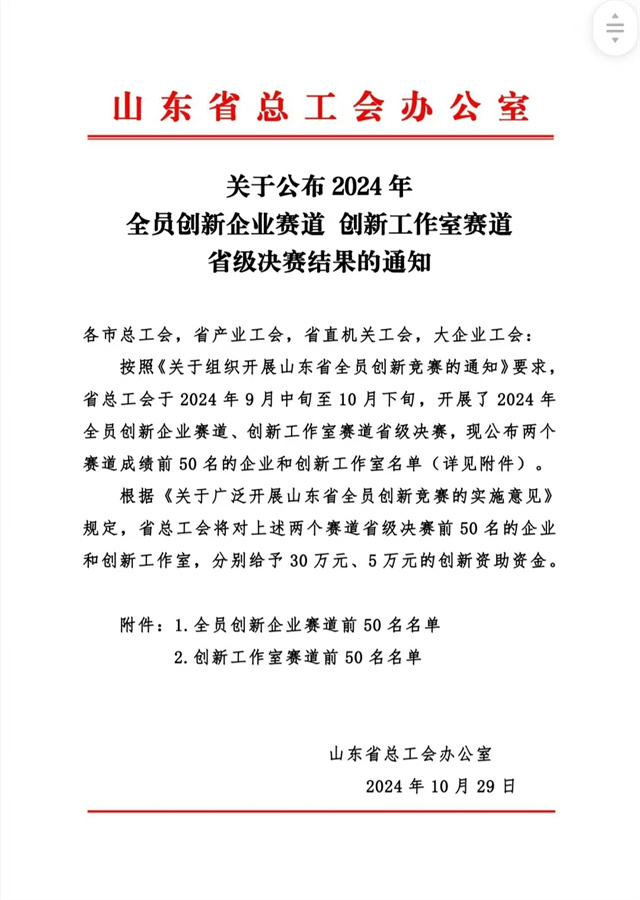 近日,山東省總工會(huì)公布了2024年全員創(chuàng)新企業(yè)賽道、創(chuàng)新工作室賽道名單,在全員創(chuàng)新企業(yè)賽道,公司成功入選!