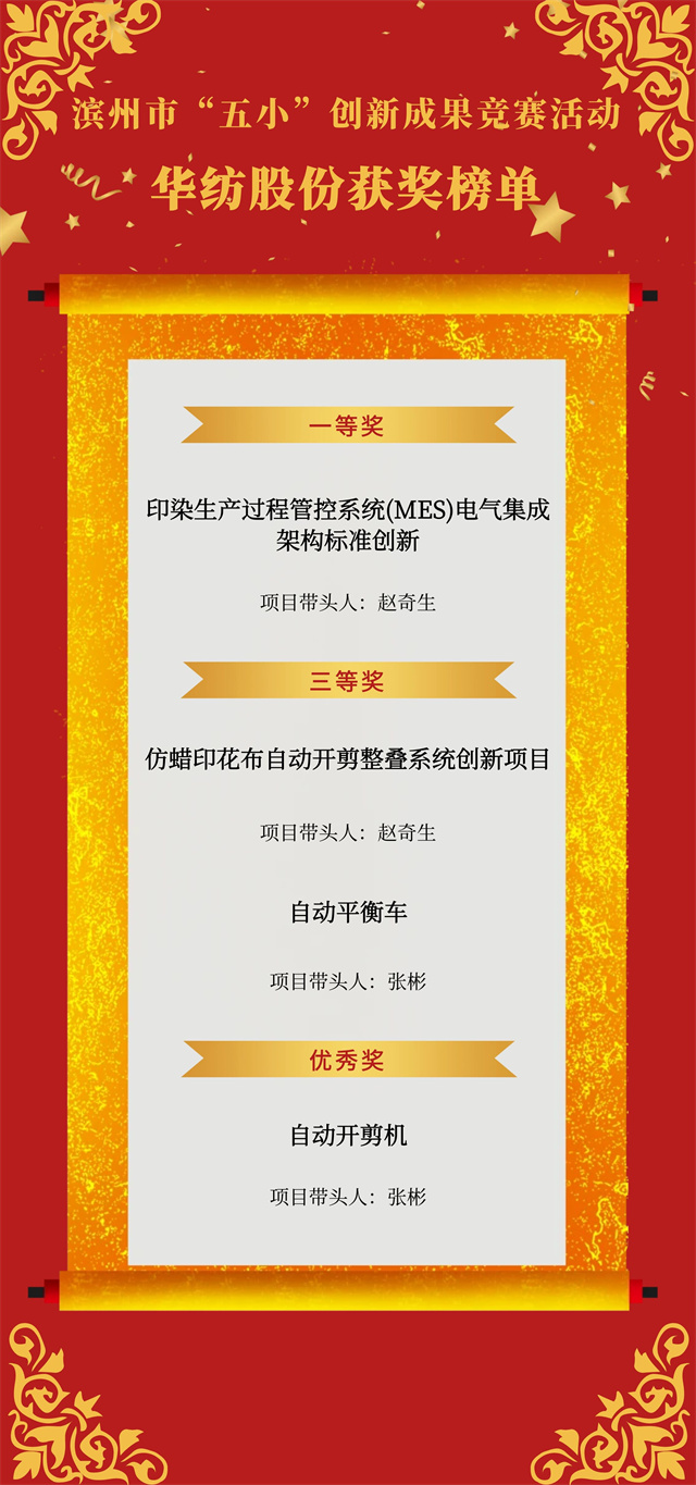 近日,市總工會(huì)開展的濱州市“五小”創(chuàng)新成果競賽活動(dòng)獲獎(jiǎng)名單公布,公司申報(bào)的4項(xiàng)“五小”競賽創(chuàng)新成果喜獲殊榮,其中,《印染生產(chǎn)過程管控系統(tǒng)(MES)電氣集成架構(gòu)標(biāo)準(zhǔn)創(chuàng)新》獲一等獎(jiǎng),《仿蠟印花布自動(dòng)開剪整疊系統(tǒng)創(chuàng)新項(xiàng)目》《自動(dòng)平衡車》獲三等獎(jiǎng),《自動(dòng)開剪機(jī)》獲優(yōu)秀獎(jiǎng)。