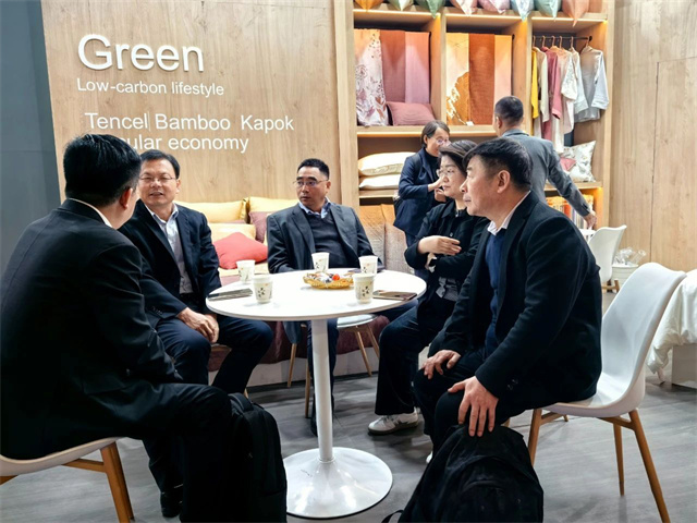 展會首日,中國紡織工業(yè)聯(lián)合會副會長楊兆華等領(lǐng)導(dǎo)專程到華紡股份展位參觀指導(dǎo)。領(lǐng)導(dǎo)們認真聽取了家紡公司總經(jīng)理成汝海對家紡產(chǎn)品的介紹,仔細觀看了解了各類展品。楊兆華副會長對華紡股份有限公司在產(chǎn)業(yè)升級、產(chǎn)品結(jié)構(gòu)調(diào)整方面取得的成績給予了充分肯定,希望公司繼續(xù)加大研發(fā)投入,提升產(chǎn)品科技含量和附加值,進一步加強品牌建設(shè),提高中國家紡產(chǎn)品在國際市場的知名度和影響力。
